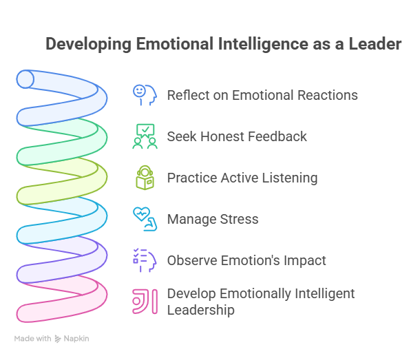 Emotional intelligence is not fixed; it can be strengthened with intention and practice. Leaders can improve their emotional intelligence by: