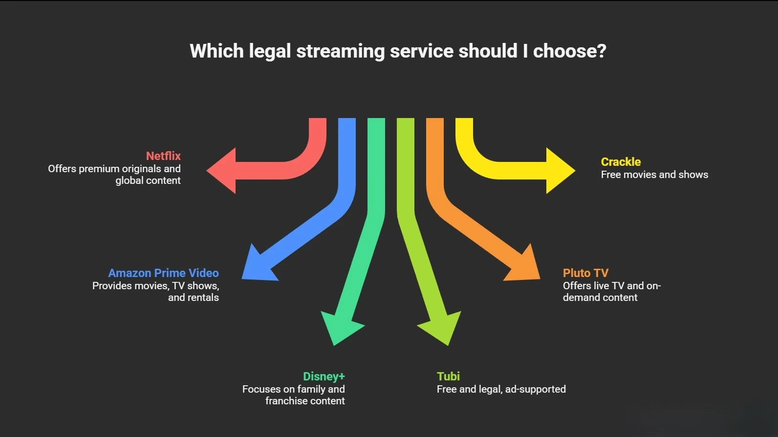 Legal alternatives include Netflix, Tubi, Pluto TV, Amazon Prime Video, and Crackle.